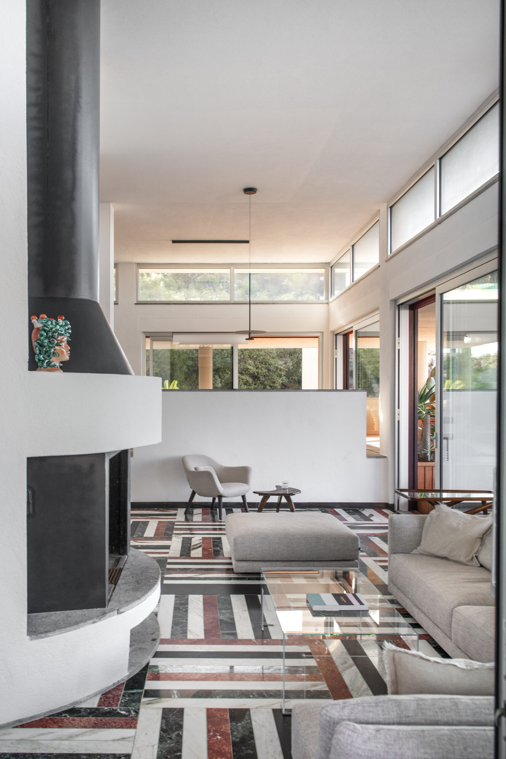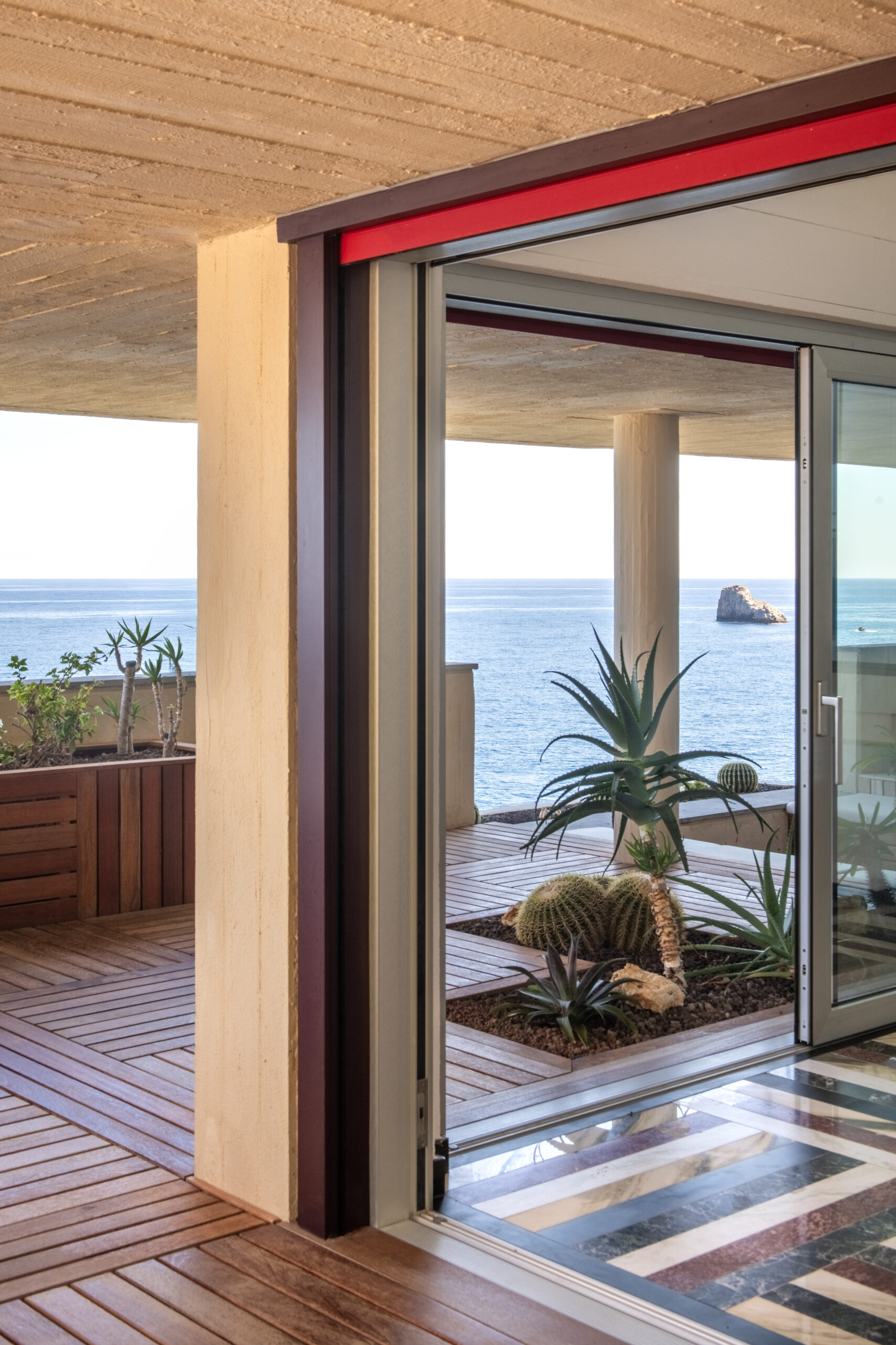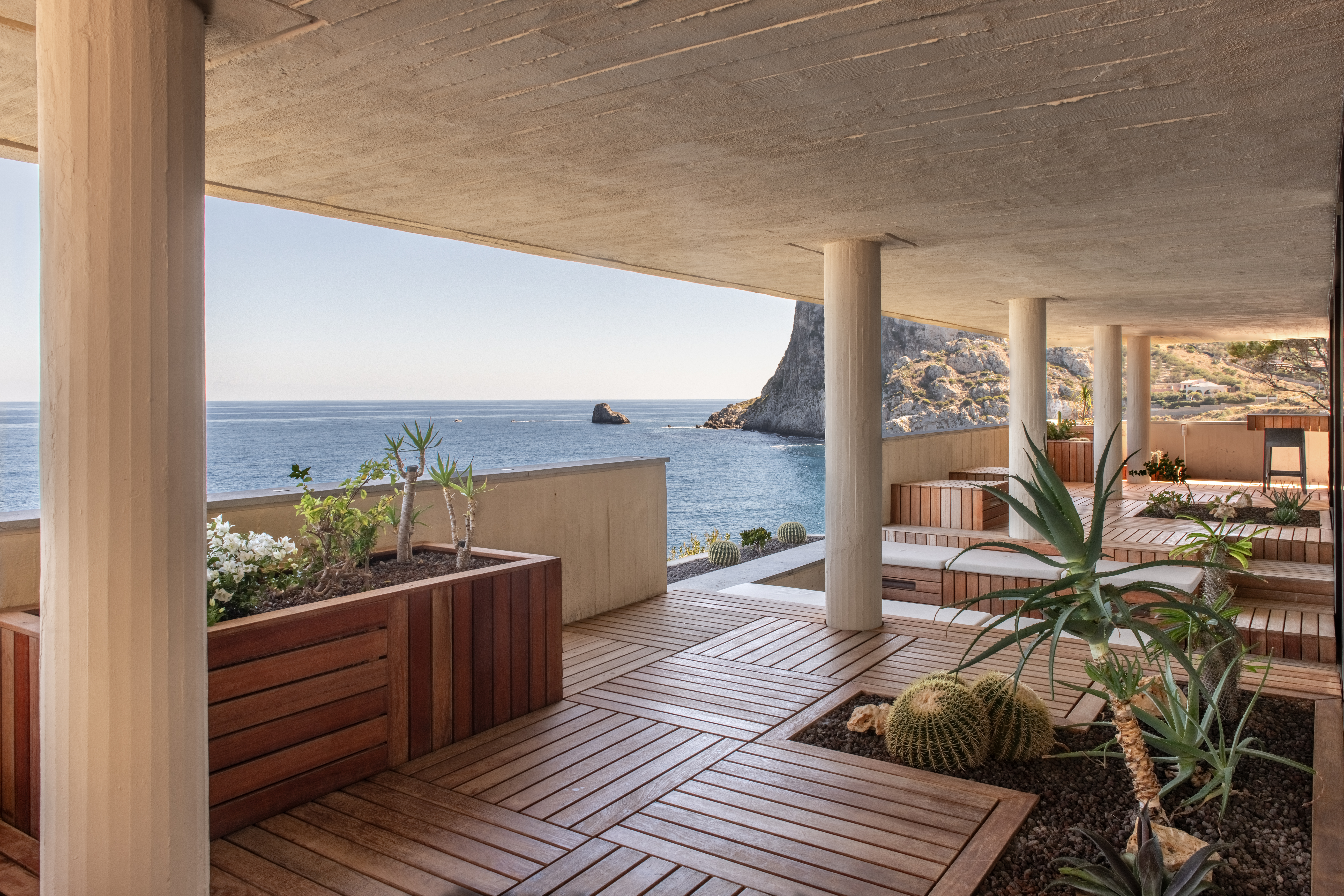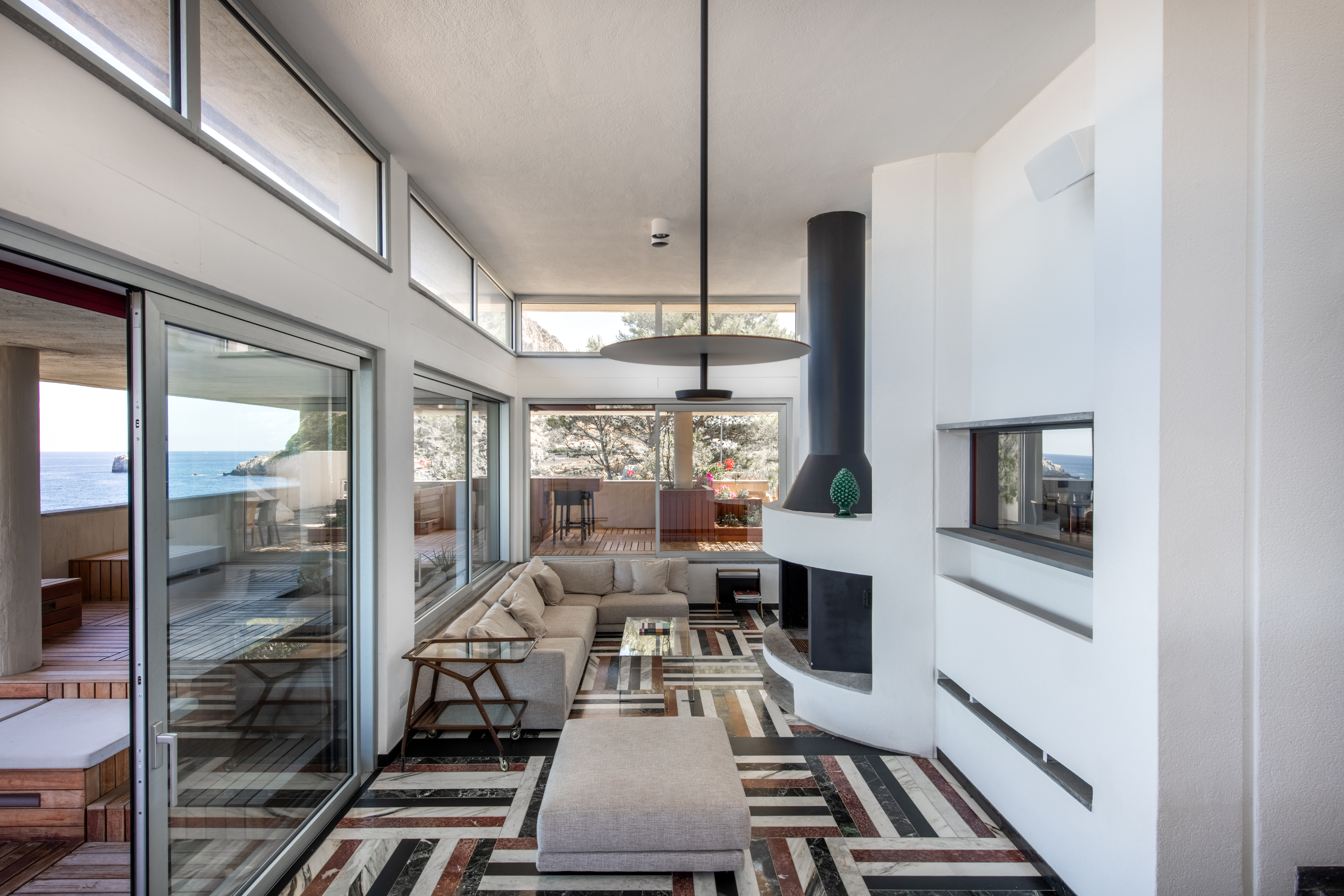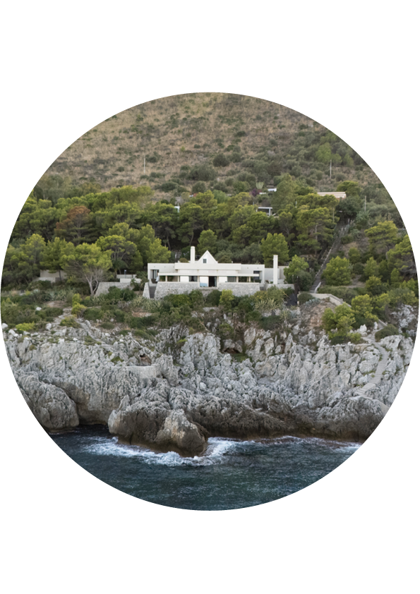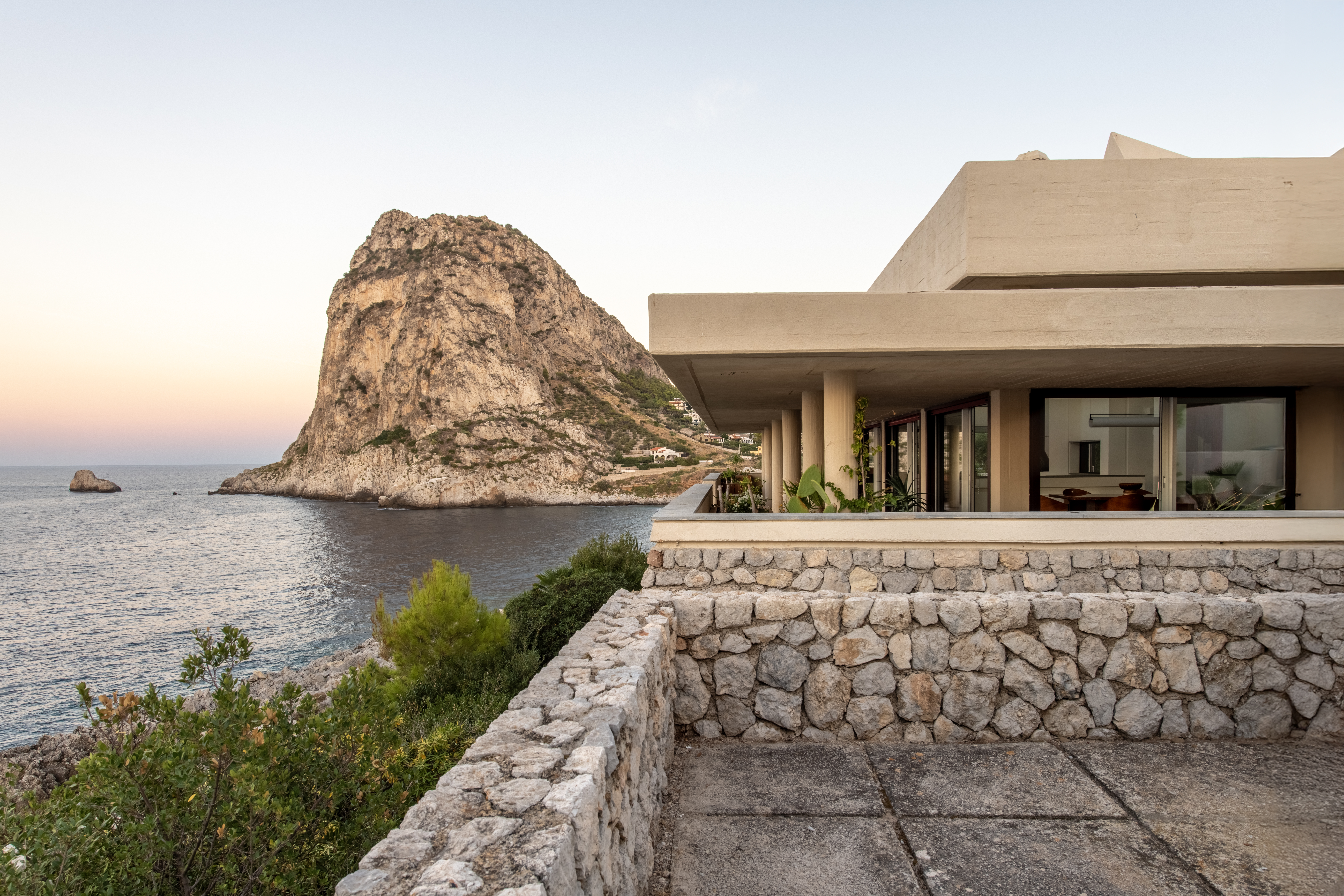 Conçue selon une trame répétitive de carrés de 90 × 90 cm, la maison s’organise en une succession d’espaces qui épousent la topographie de la falaise. Cette géométrie directrice (à l’origine de l’architecte sicilien qui habite toujours le voisinage) structure autant les volumes que les cadrages sur la mer. Les dalles basses et massives, formant de puissantes lignes horizontales, s’alignent naturellement sur l’horizon et prolongent le dialogue constant entre l’architecture et le paysage marin.