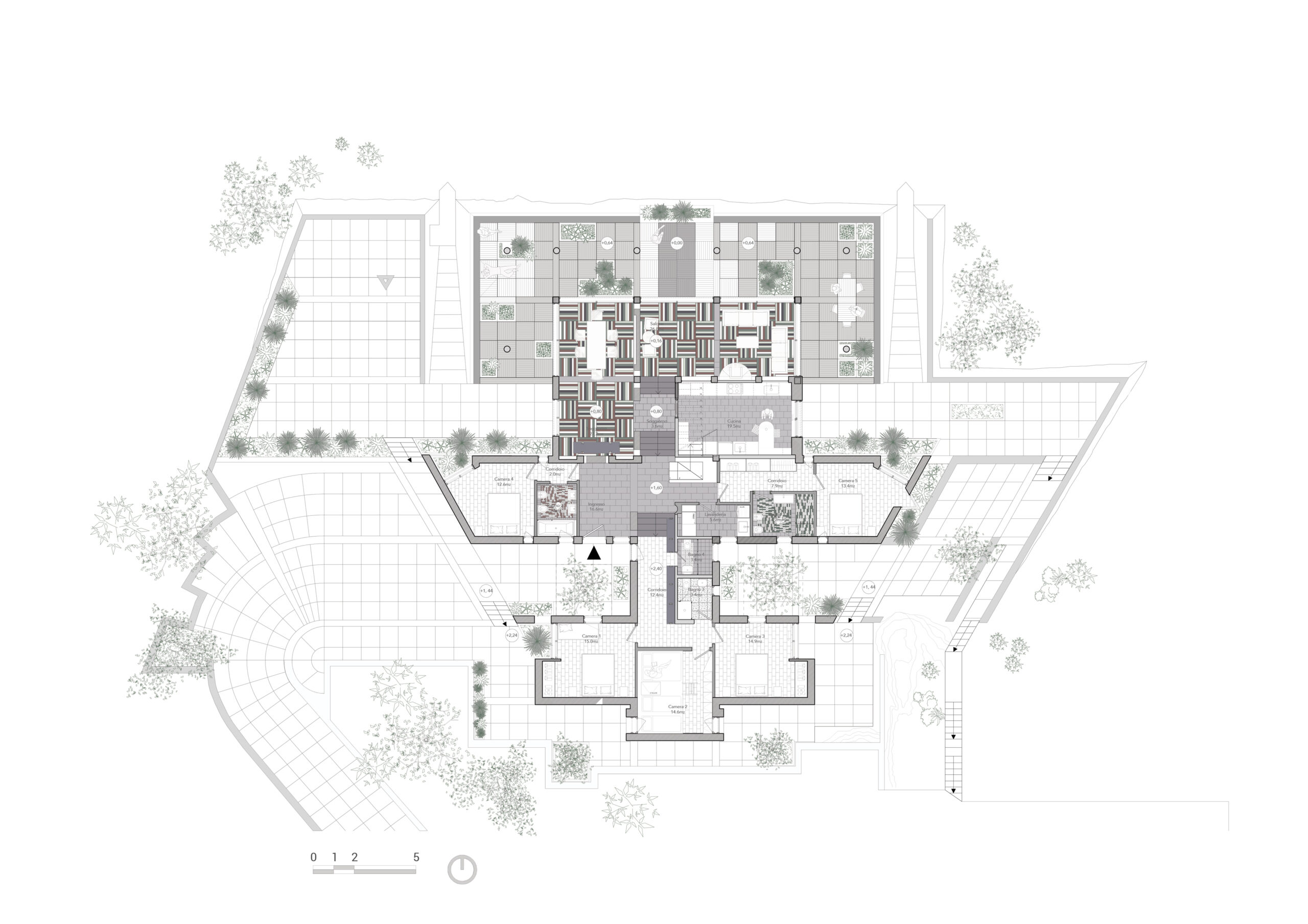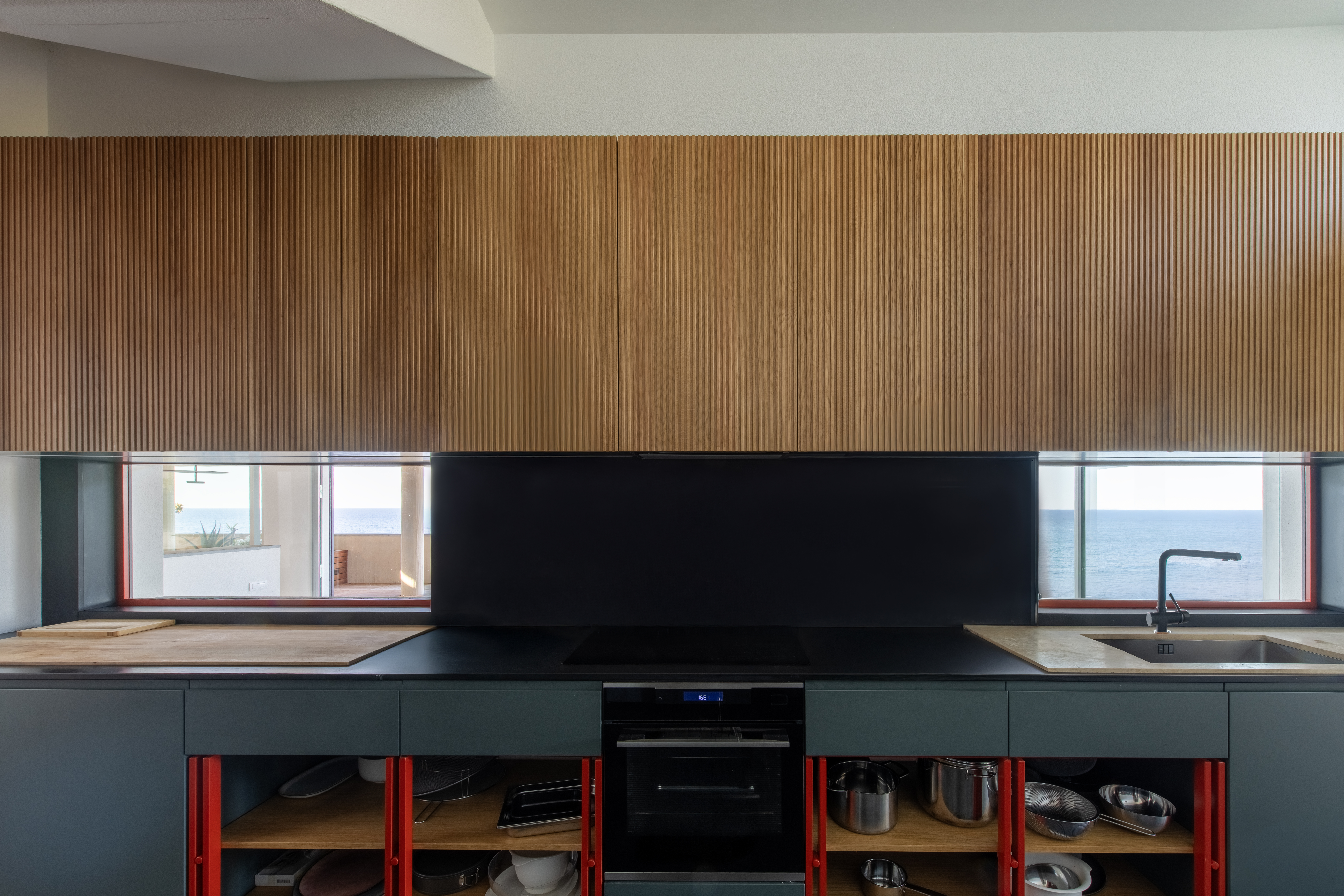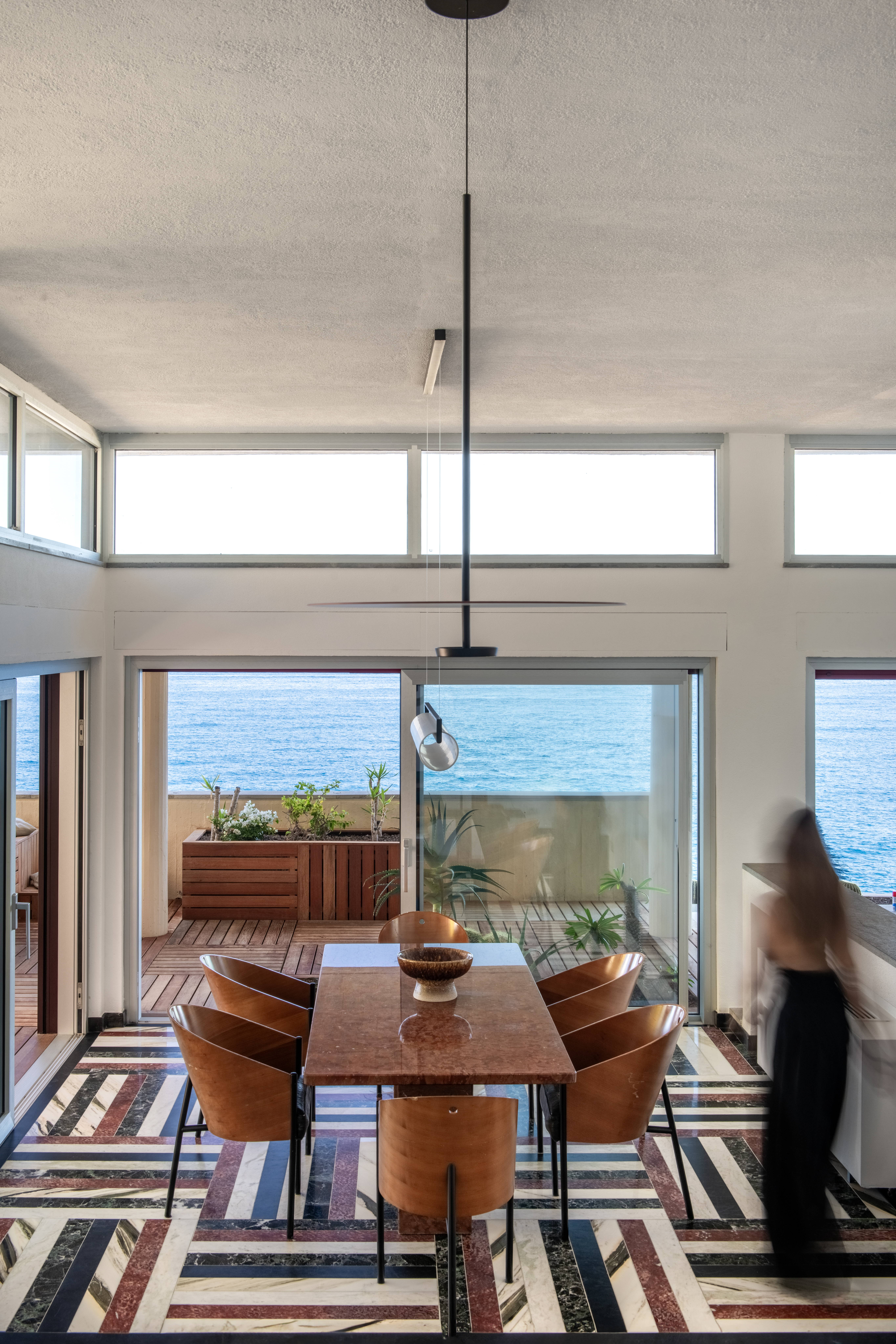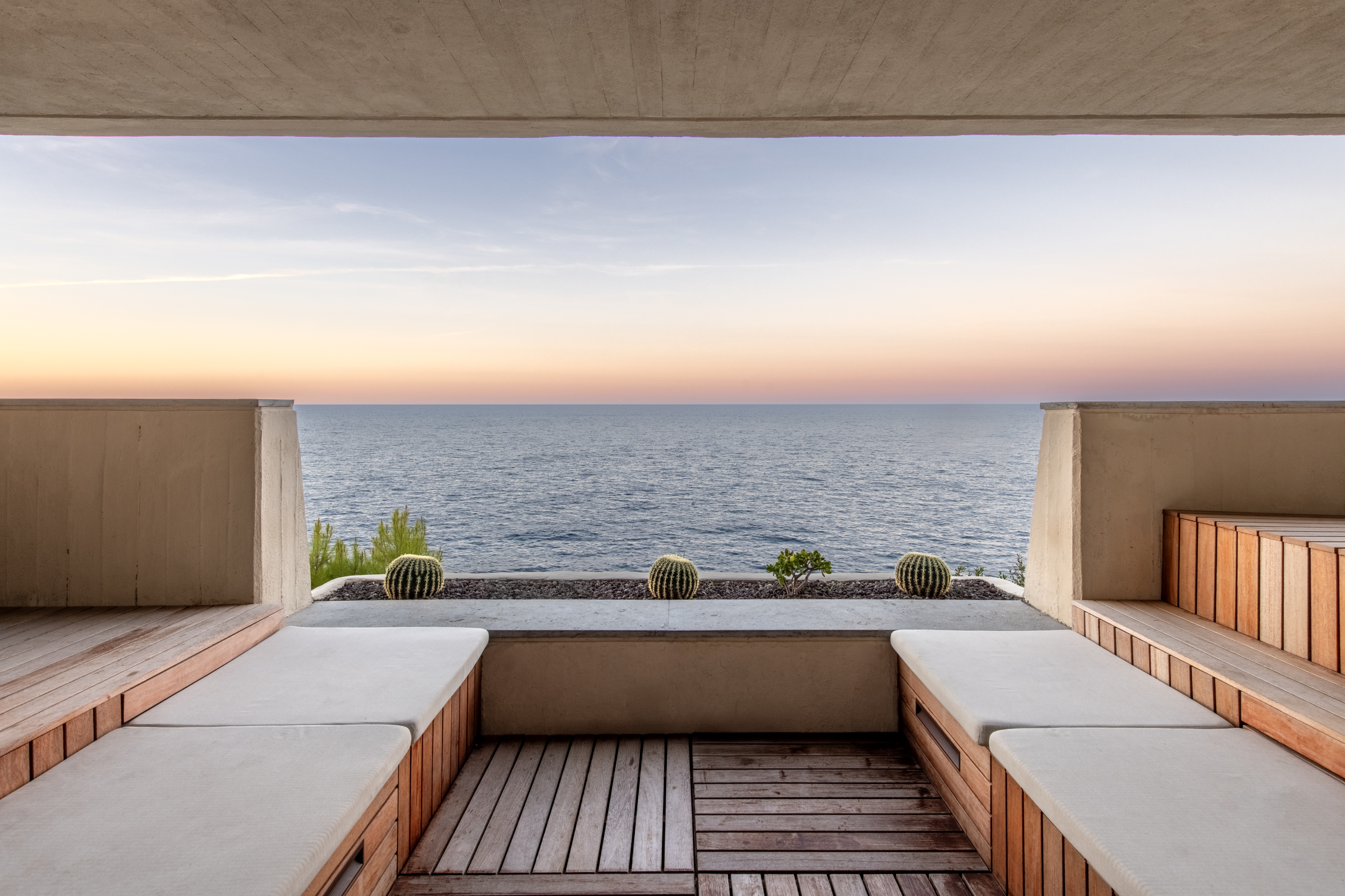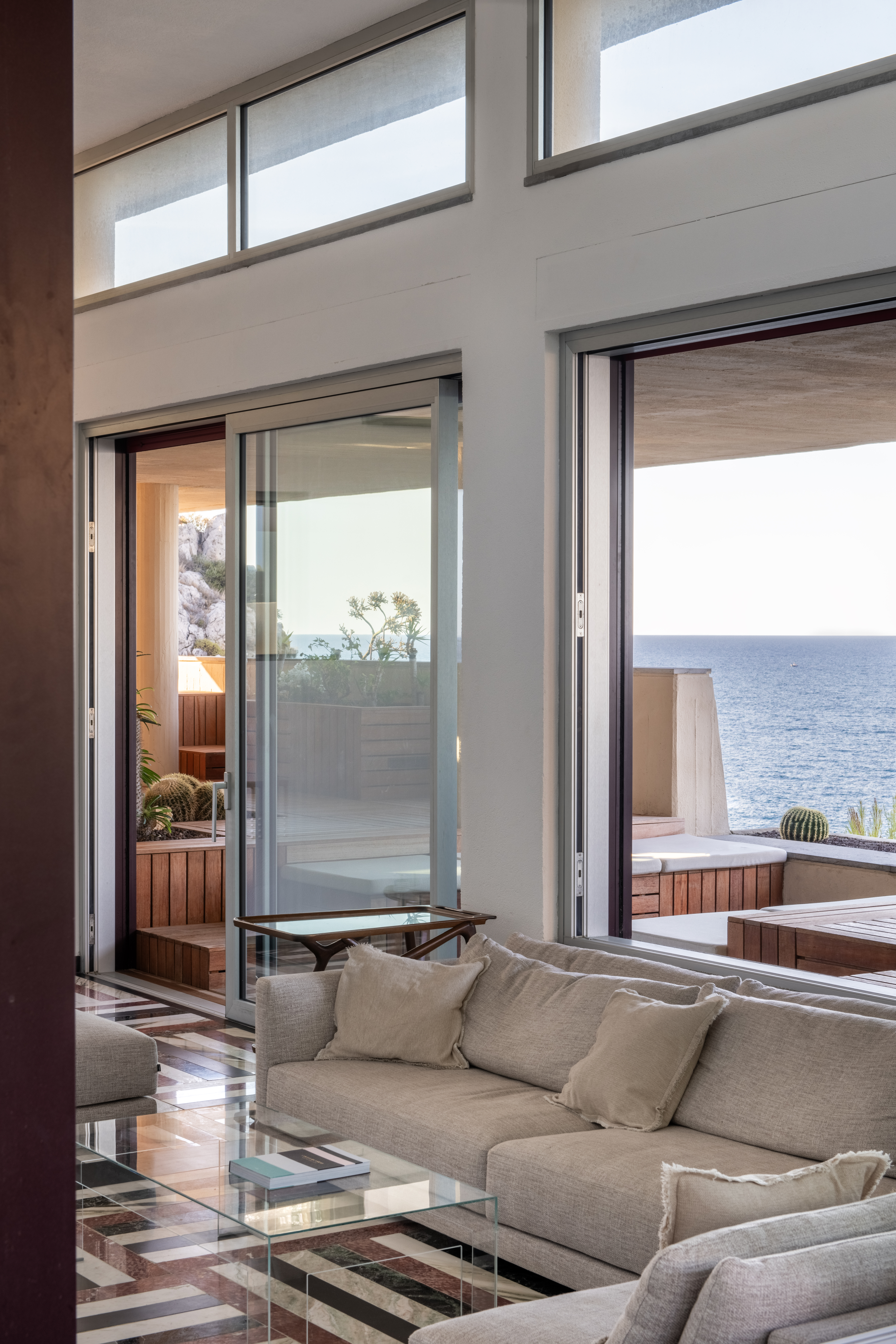 Conçue selon une trame répétitive de carrés de 90 × 90 cm, la maison s’organise en une succession d’espaces qui épousent la topographie de la falaise. Cette géométrie directrice (à l’origine de l’architecte sicilien qui habite toujours le voisinage) structure autant les volumes que les cadrages sur la mer. Les dalles basses et massives, formant de puissantes lignes horizontales, s’alignent naturellement sur l’horizon et prolongent le dialogue constant entre l’architecture et le paysage marin.