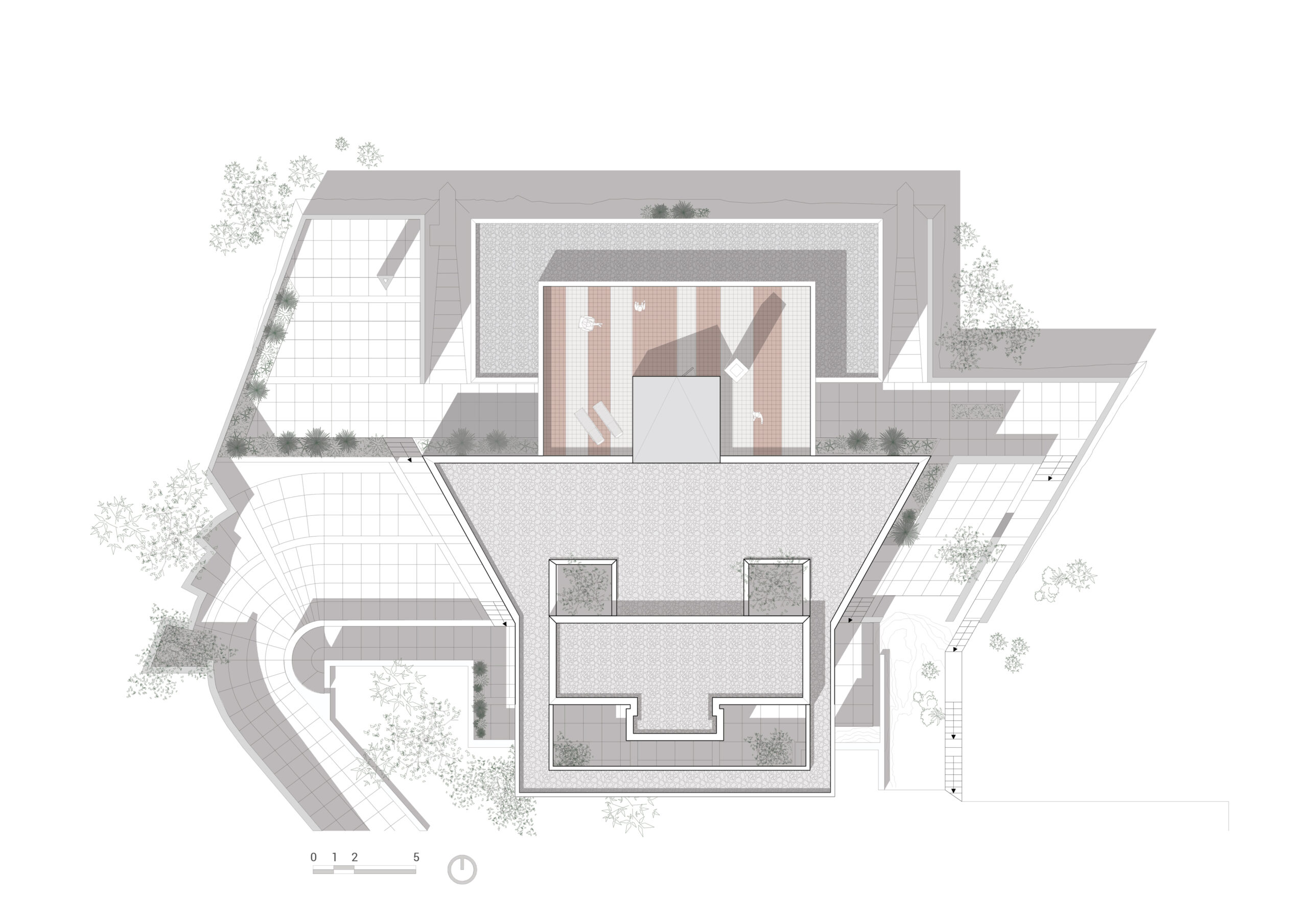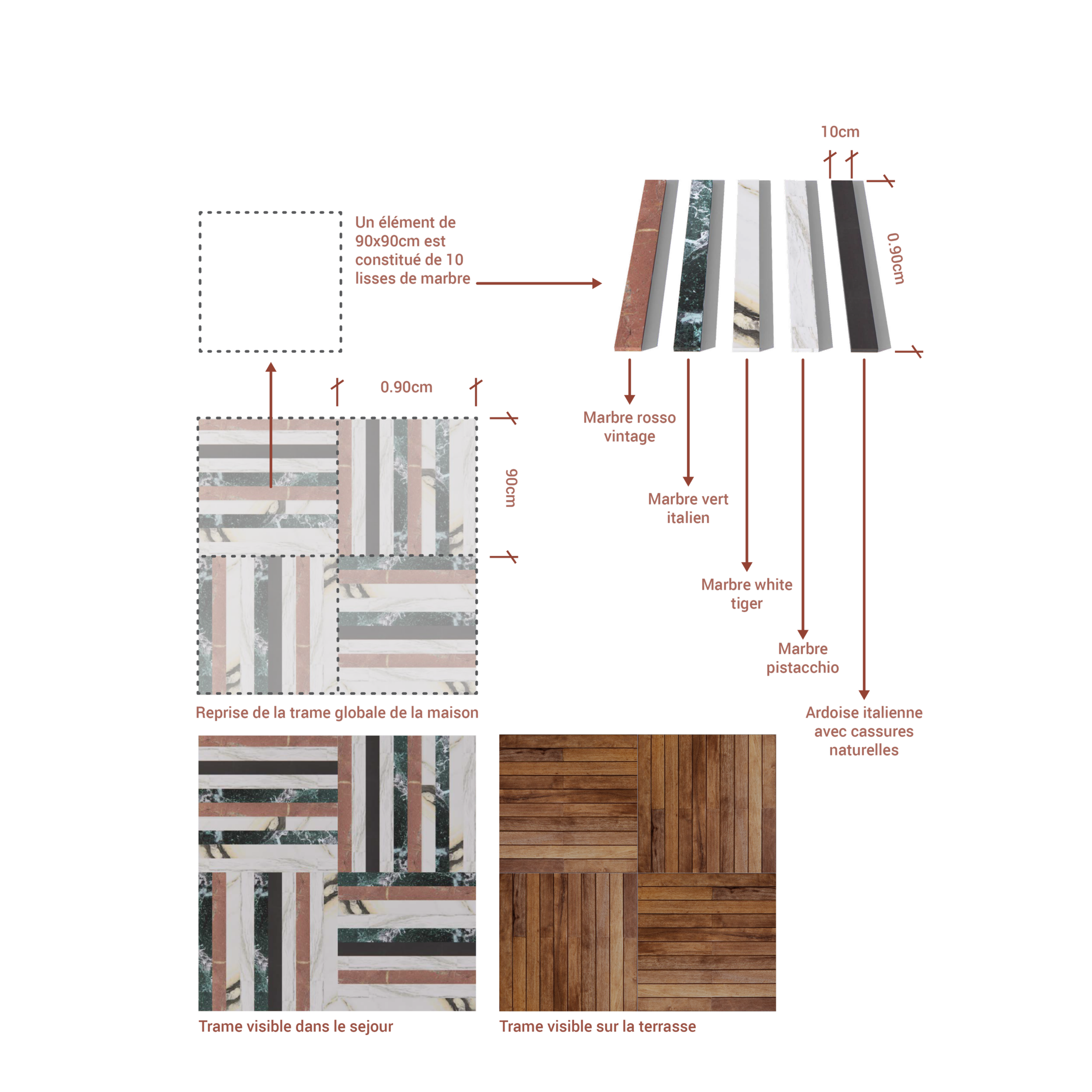 La forme spécifique et la structure de la maison reposent sur le travail d’une trame partant d’un carré de 90 × 90 cm qui se répète. Alignés les uns aux autres, les carrés délimitent les espaces extérieurs et intérieurs. En parallèle, le projet s’inscrit dans la lignée de ce concept structurel et organisationnel : les espaces sont retravaillés par le prolongement de cette trame vers l’intérieur.